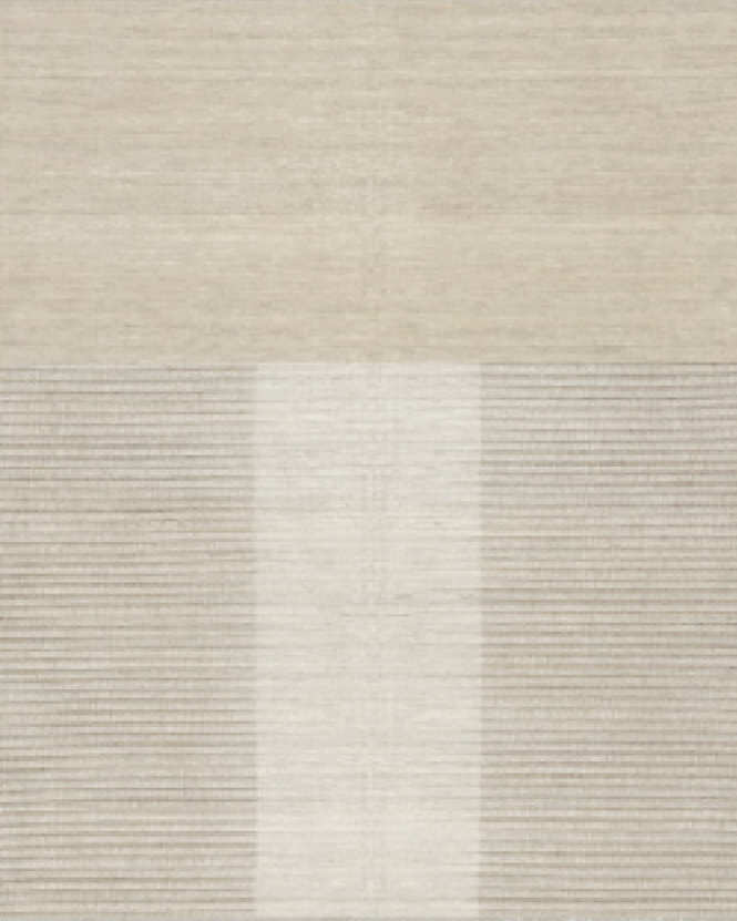 Hand-knotted rug. Made of undyed wool, nettle, and silk. Mix of cut pile and loop design. 100 knots per square inch. Produced in Nepal.